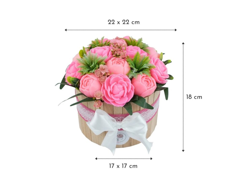 Krásná mýdlová kytice plná růžových pivoněk - kytice v dřevěném boxu