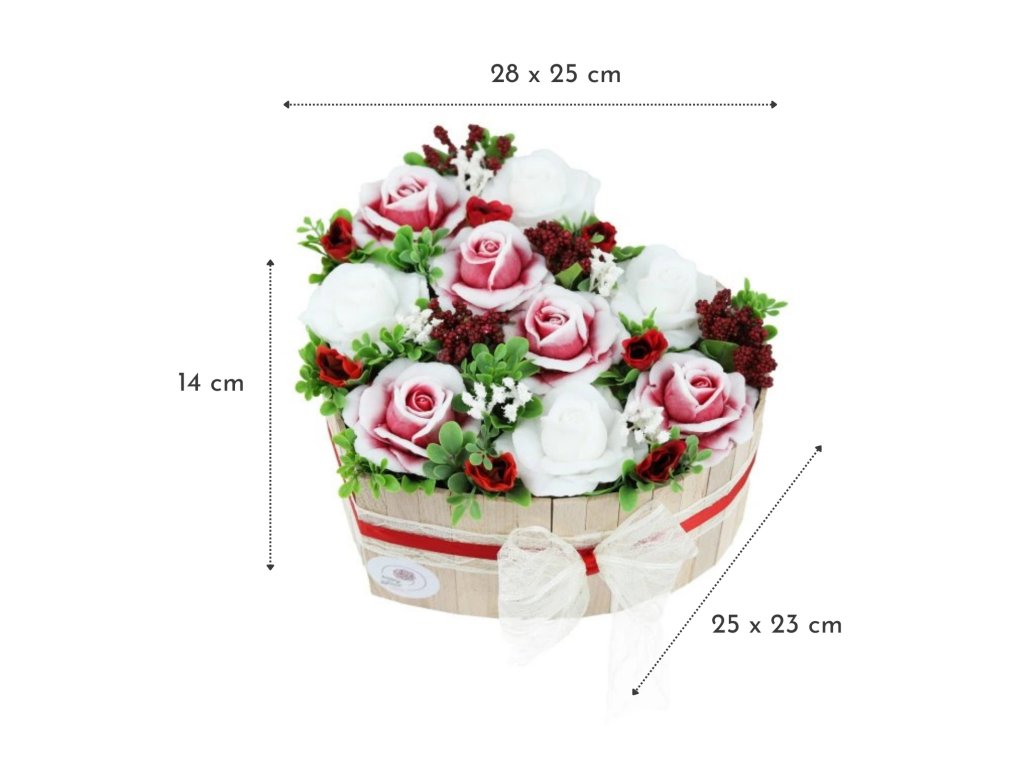 Mýdlová kytice bílých a červeno bílých růží ve tvaru srdce - kytice v dřevěném boxu