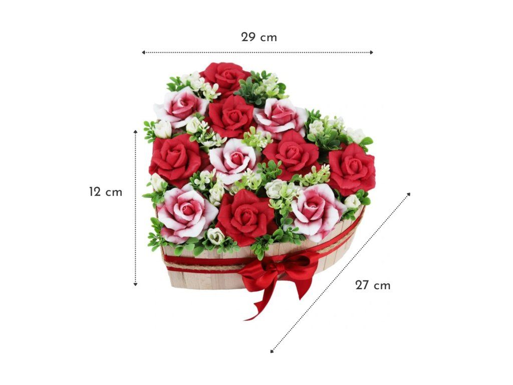 Mýdlová kytice plná červených růží v dřevěném boxu - tvar srdce, velikost L