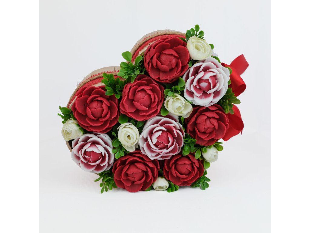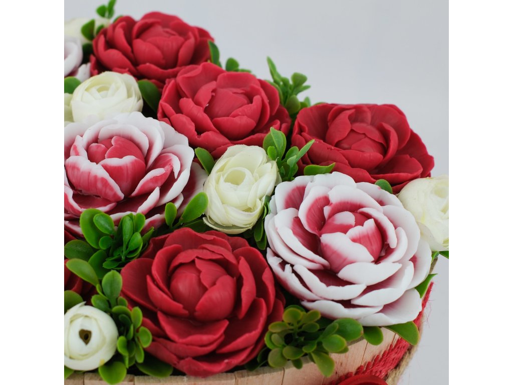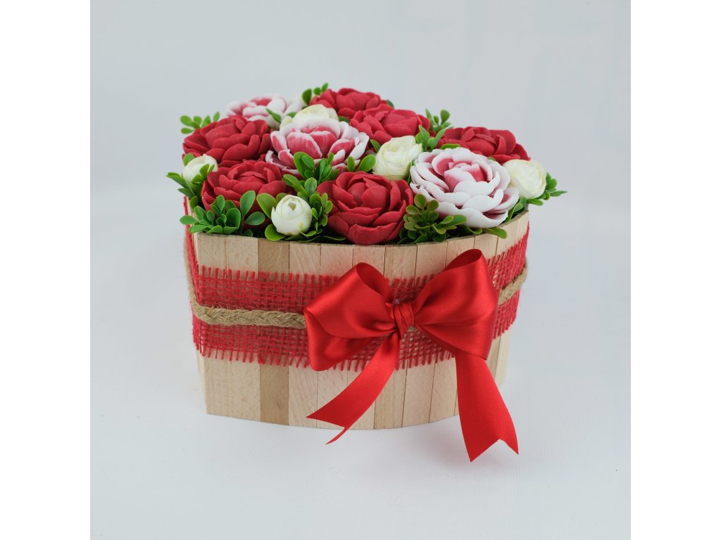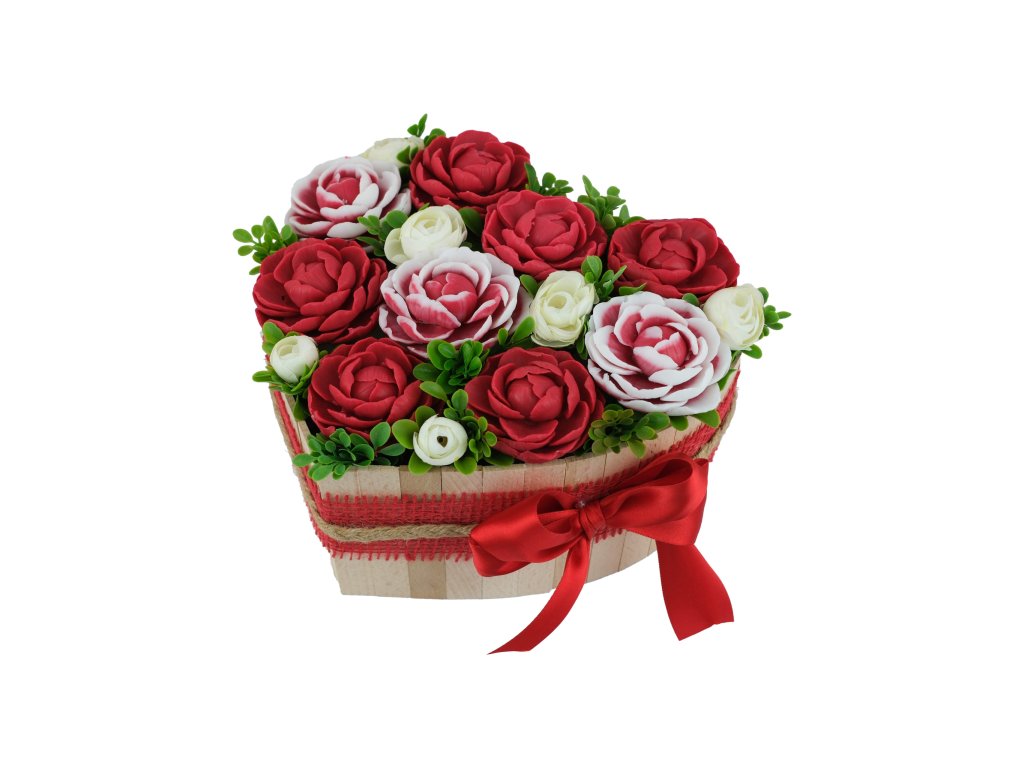 Romantická mýdlová kytice červených a červeno bílých růží ve tvaru srdce - kytice v dřevěném boxu
