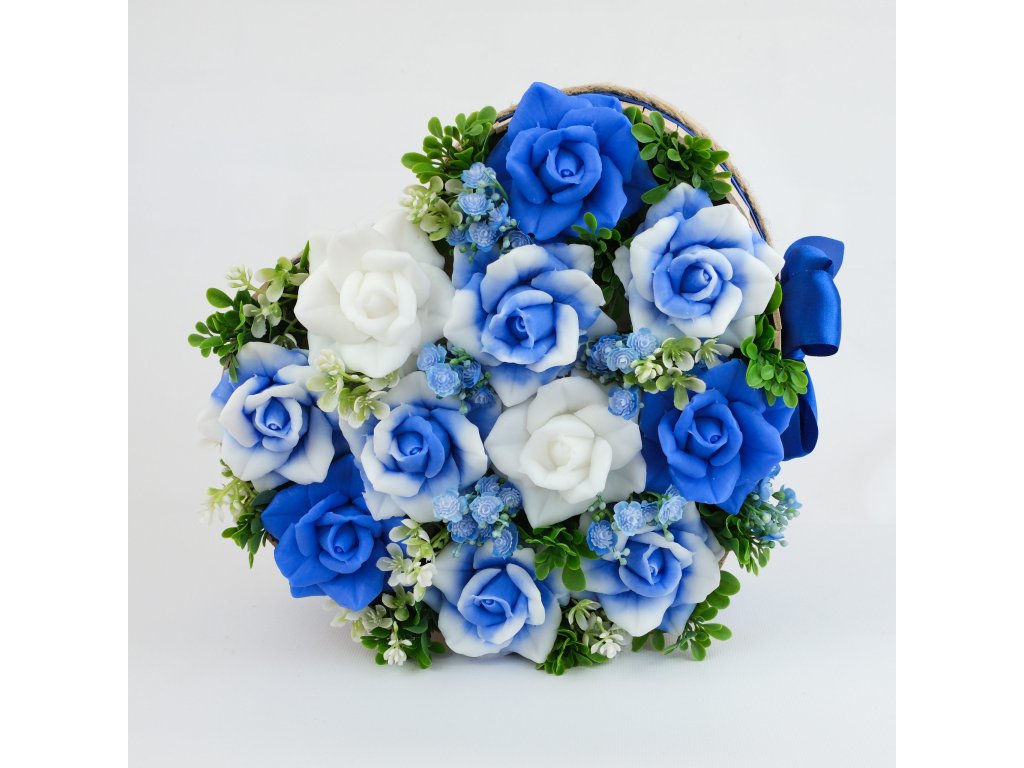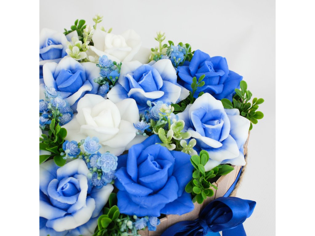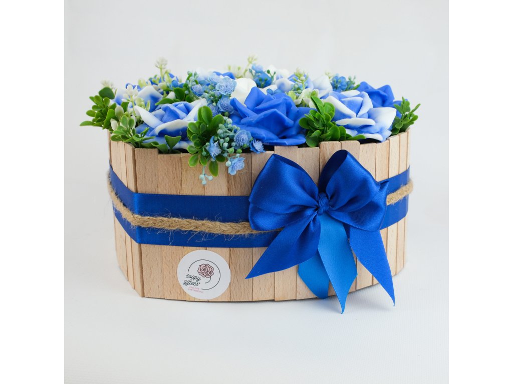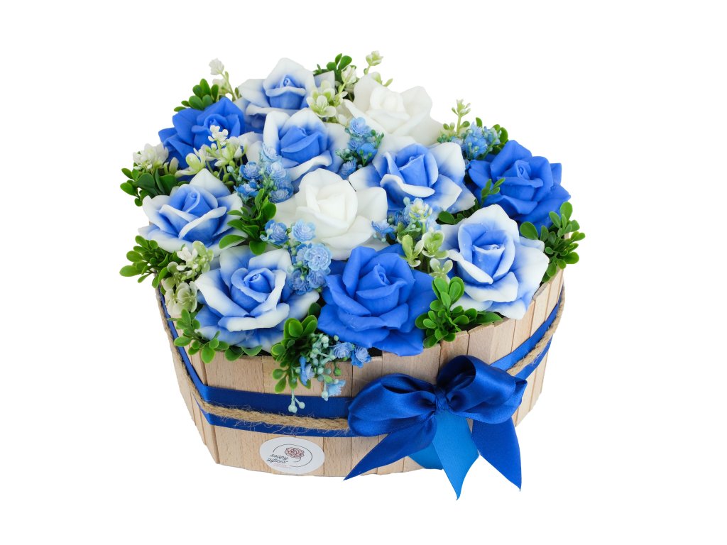 Velká mýdlová kytice modrých, bílých a modro bílých růží - kytice v dřevěném boxu - velikost L